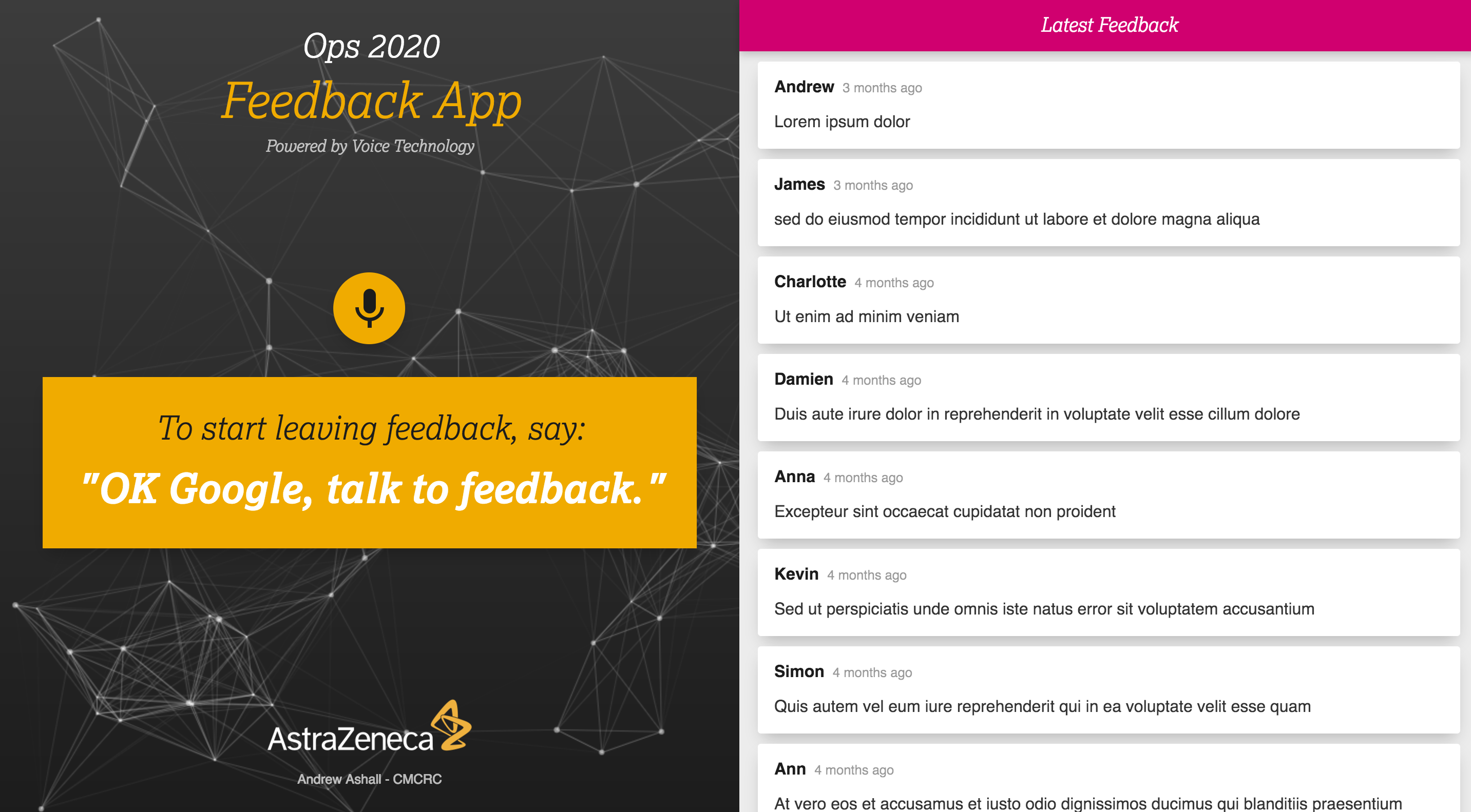 Voice controlled feedback tool to showcase the possible uses of voice technology in the workplace for an internal event at AstraZeneca. I created the architecture, designed the UI and developed the full stack including an action package for Actions on Google and a user agent in API.ai which interacts with a React front end to guide users through the feedback process.